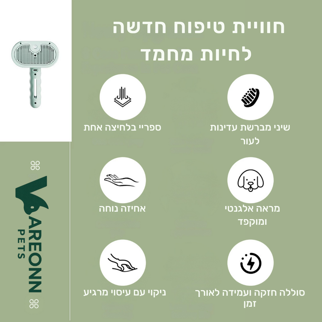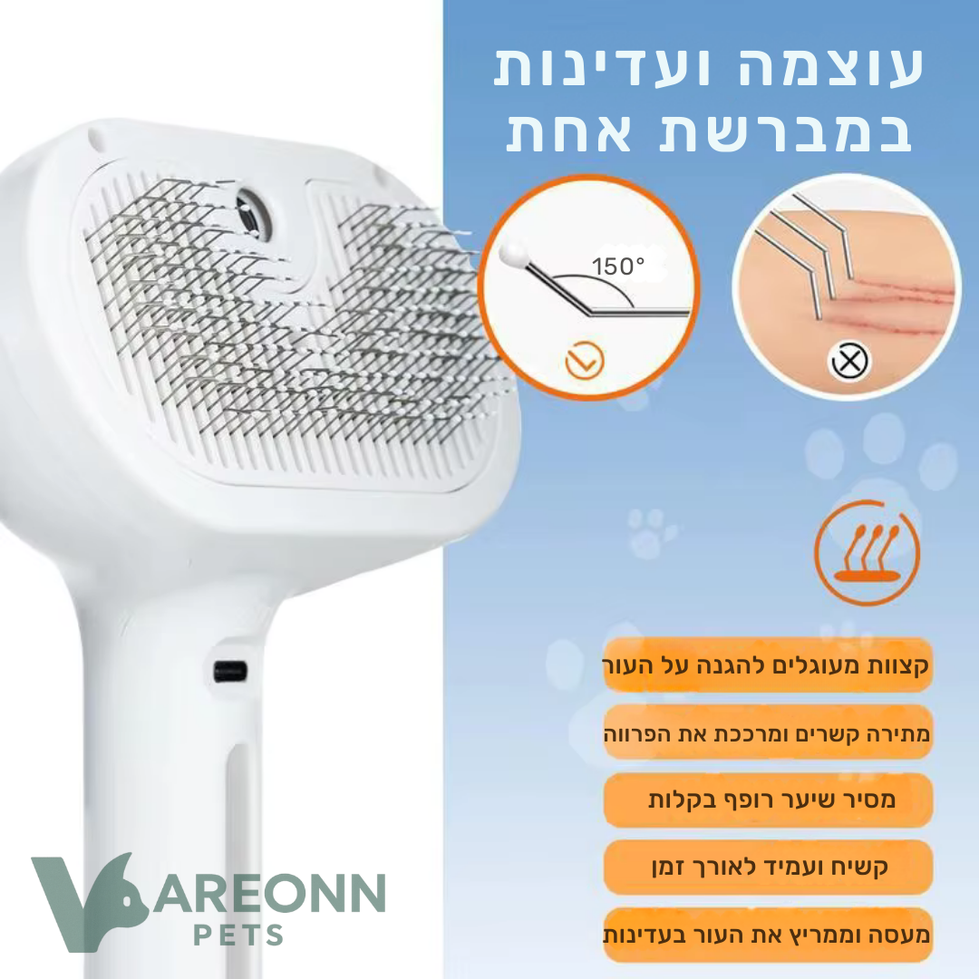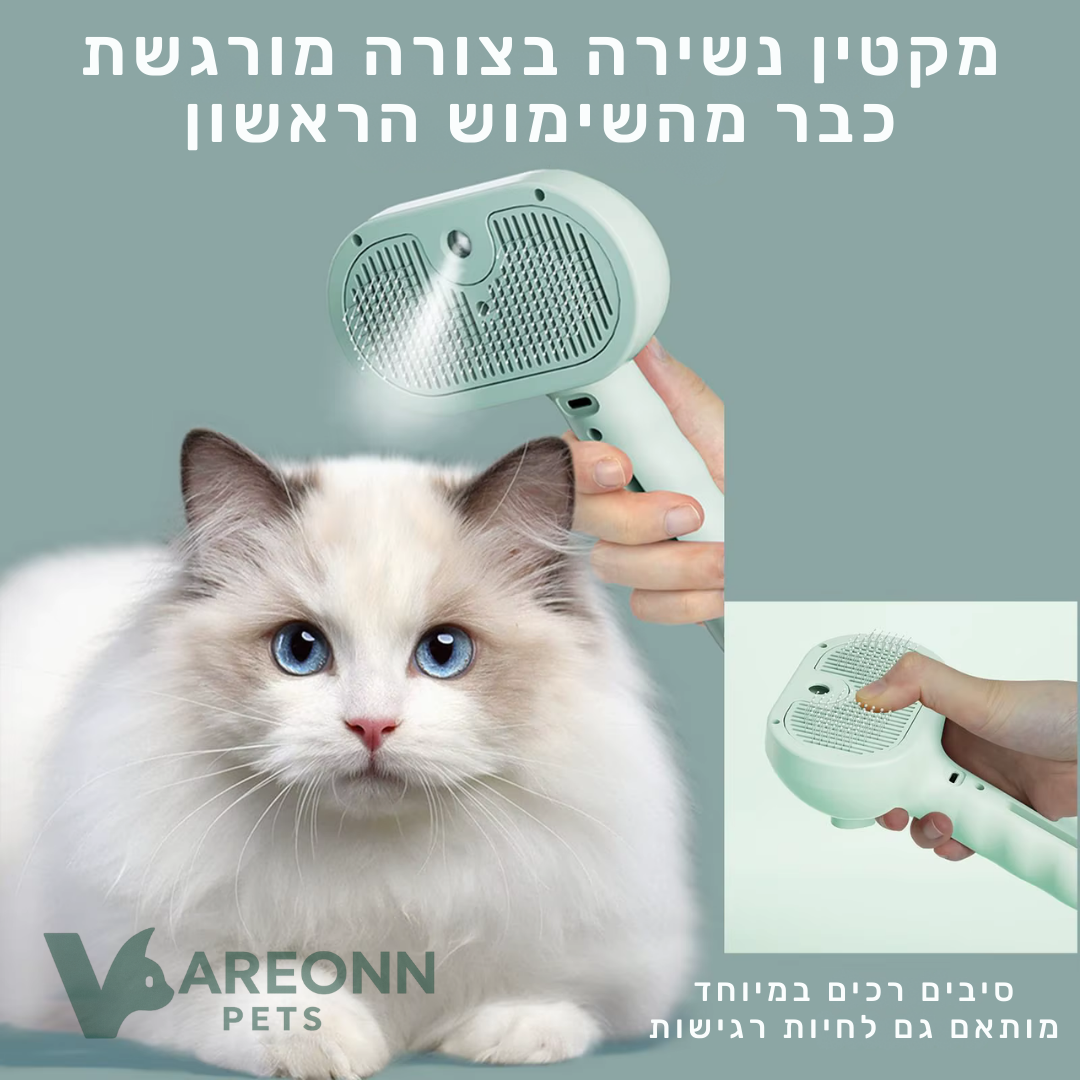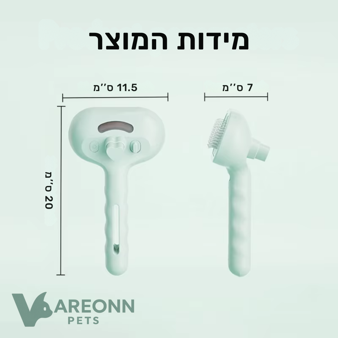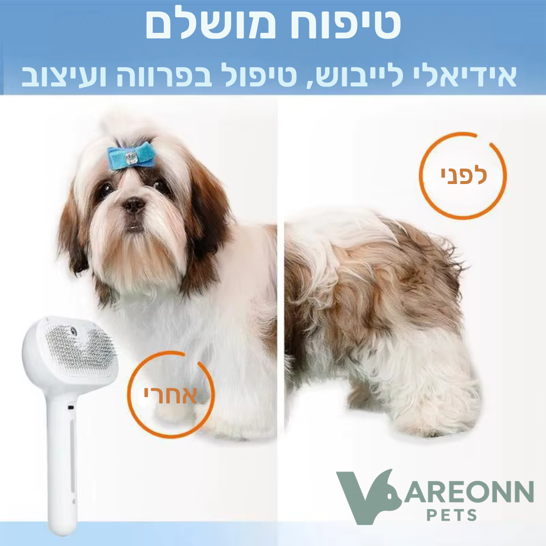 המברשת בהתזה של וואריאון חיות בית מרככת את הפרווה כבר מהרגע הראשון, משחררת קשרים בקלות ומפחיתה נשירה בצורה מורגשת.